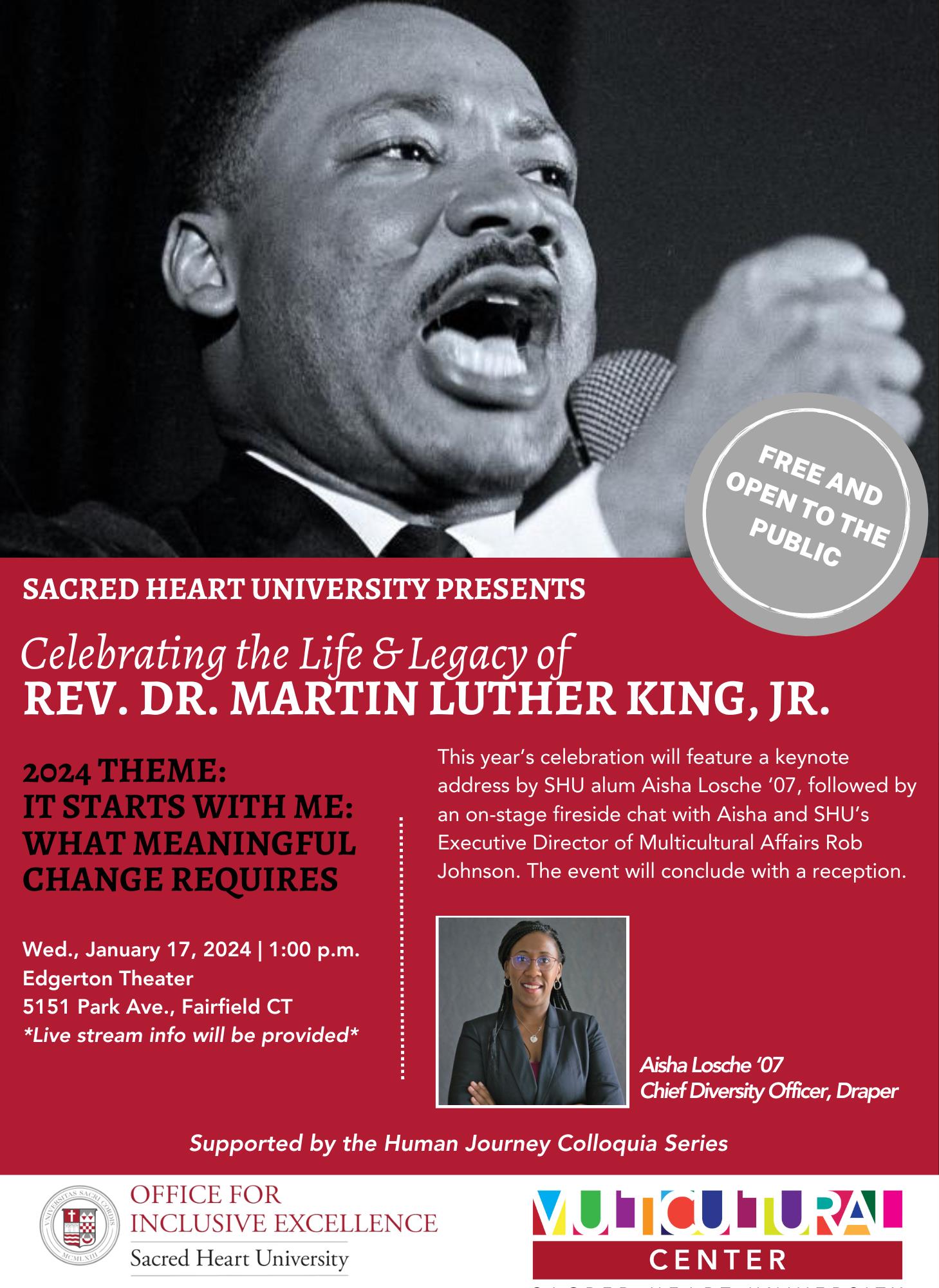 The Office for Inclusive Excellence & Multicultural Affairs presents Celebrating the Life of Rev. Dr. Martin Luther King, Jr. Join us on Wednesday, January 17th, 2024, at 1 p.m. in the Edgerton Theater to celebrate and commemorate the life and legacy of Rev. Dr. Martin Luther King Jr. Our theme for this year’s celebration is “The Power of Community”.